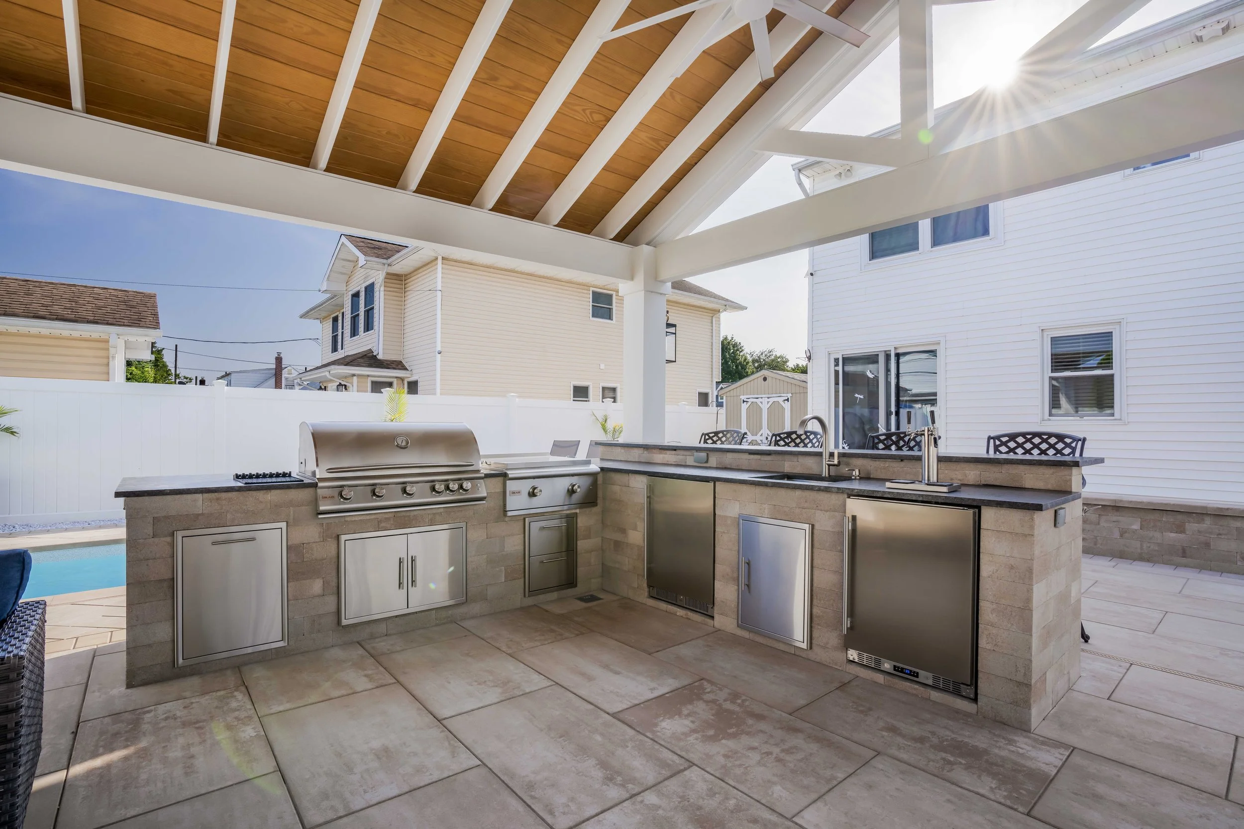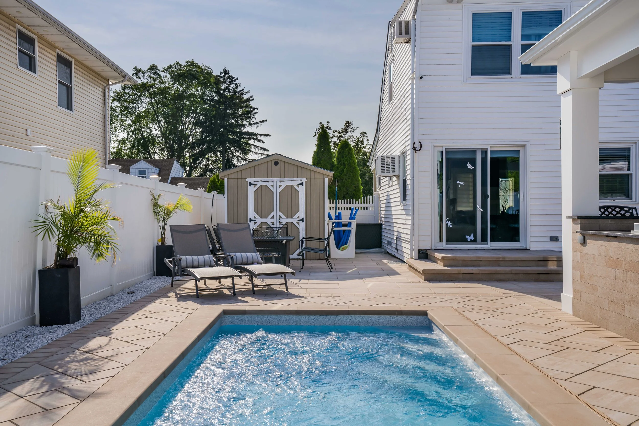 Welcome to our Hicksville Outdoor Living Retreat—a backyard built for both relaxation and entertainment. This beautifully designed space features a custom 8’x21’ in-ground vinyl pool, spacious Cambridge paver patio, fully equipped outdoor kitchen, and a gorgeous pavilion + pergola setup. Every detail was thoughtfully planned and professionally executed to elevate the way our clients enjoy their home.